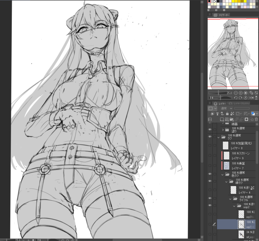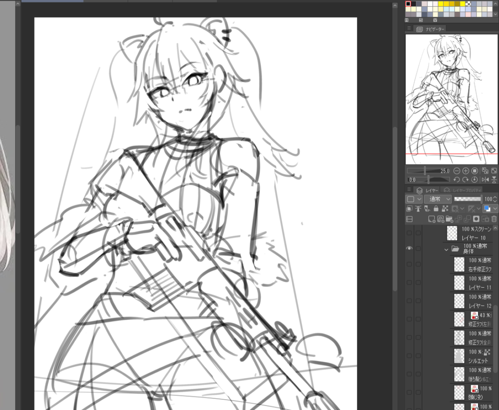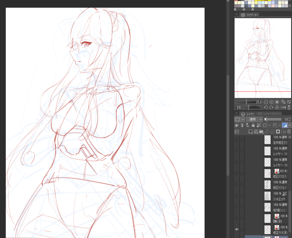 続いて下の画像のようにラフを透かして修正を試みてみましたがうまくいきません。