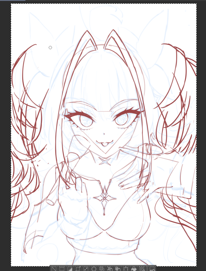 わかりやすいようにラフを青系の色にした後、不透明度を下げて赤系の色で修正していきます
